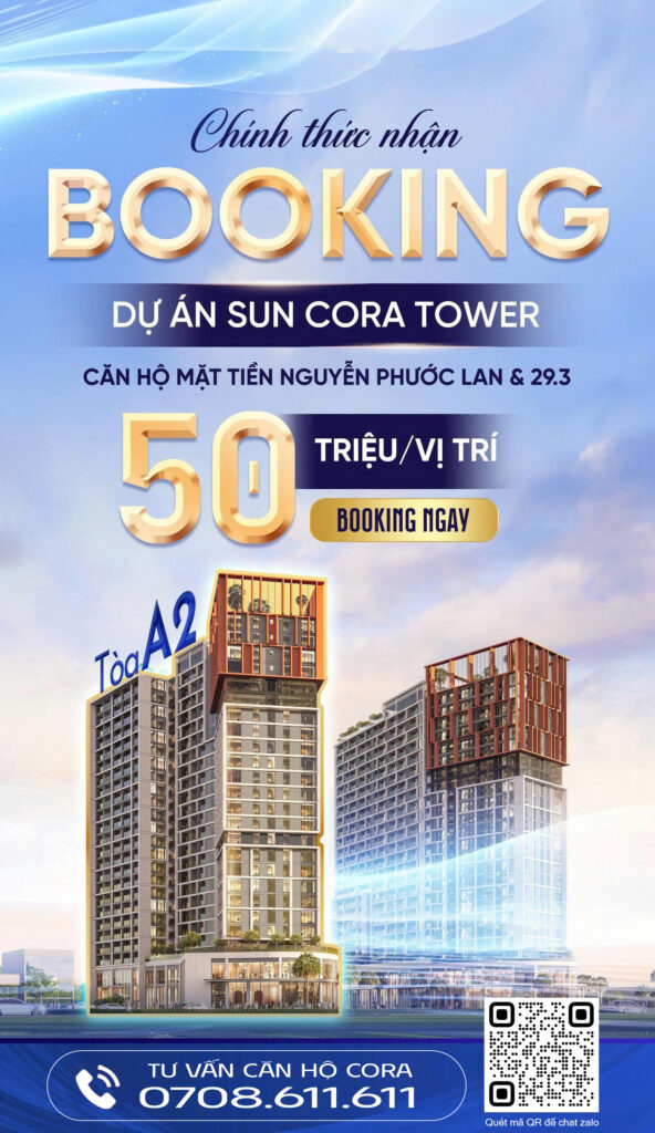 Dự án Cora Tower tiếp tục tạo sóng ở Hòa Xuân. Sau khi tòa A1 được đặt chỗ gần như toàn bộ, Sun Group mở bán tòa A2 với số lượng căn đẹp còn lại không nhiều.
